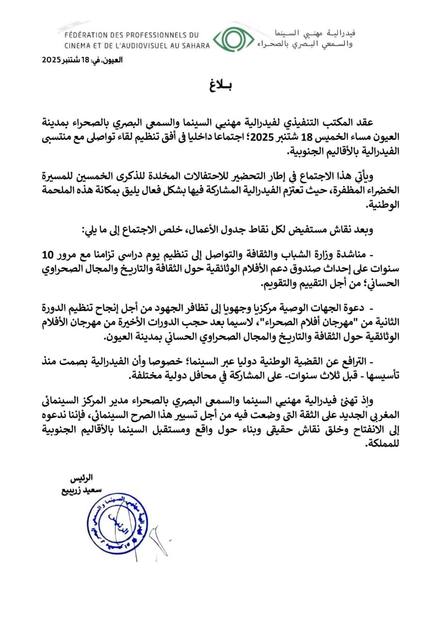 ÚÞÏ ÇáãßÊÈ ÇáÊäÝíÐí áÝíÏÑÇáíÉ ãåäíí ÇáÓíäãÇ æÇáÓãÚí ÇáÈÕÑí ÈÇáÕÍÑÇÁ ÈãÏíäÉ ÇáÚíæä ãÓÇÁ ÇáÎãíÓ 18 ÔÊäÈÑ 2025º ÇÌÊãÇÚÇ ÏÇÎáíÇ Ýí ÃÝÞ ÊäÙíã áÞÇÁ ÊæÇÕáí ãÚ ãäÊÓÈí ÇáÝíÏÑÇáíÉ ÈÇáÃÞÇáíã ÇáÌäæÈíÉ.